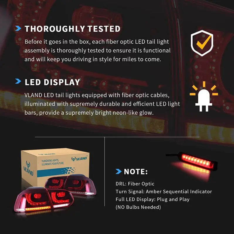 Does your 2008-2013 Volkswagen Golf MK6 deserve lighting that matches its iconic design? Factory taillights often fail to capture your hatchback's true character with dated illumination and lackluster styling. VLAND's precision-engineered LED taillights deliver a complete transformation, featuring dynamic sequential technology and premium construction that enhances both safety and style through seamless OEM integration.