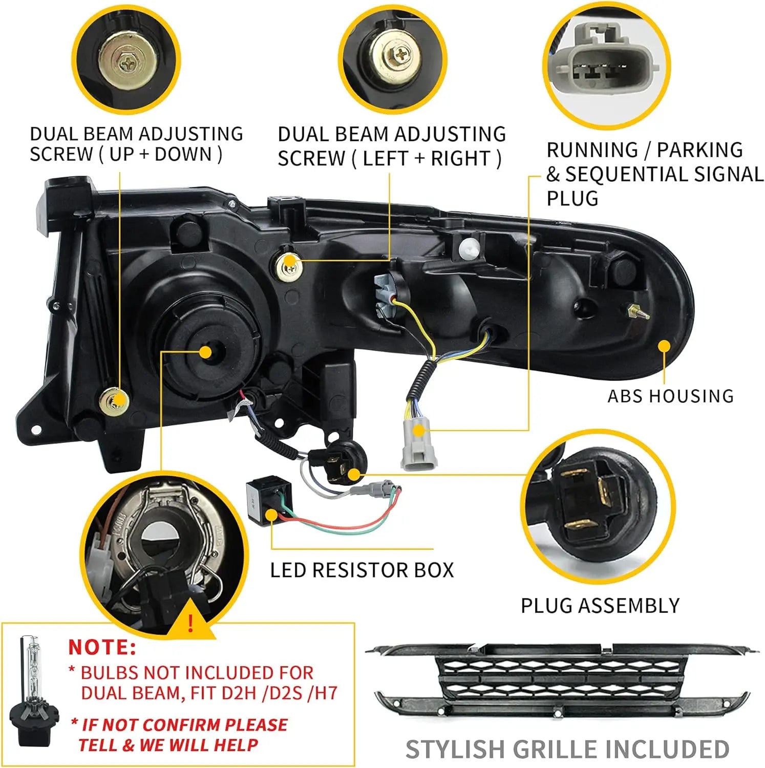 Low/High Beam: D2H HID Bulbs Recommended. (Bulbs Not Included)