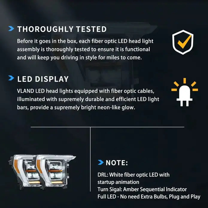 Does your 2021-2023 Ford F150 Fourteenth Gen struggle with factory lighting that fails to match its powerful capabilities? Stock headlights often leave you with inadequate nighttime visibility and a dated appearance that undermines your truck's rugged character. VLAND's precision-engineered LED projector headlights deliver a complete transformation, featuring advanced optical technology and robust construction that enhances both safety and style through seamless OEM integration.