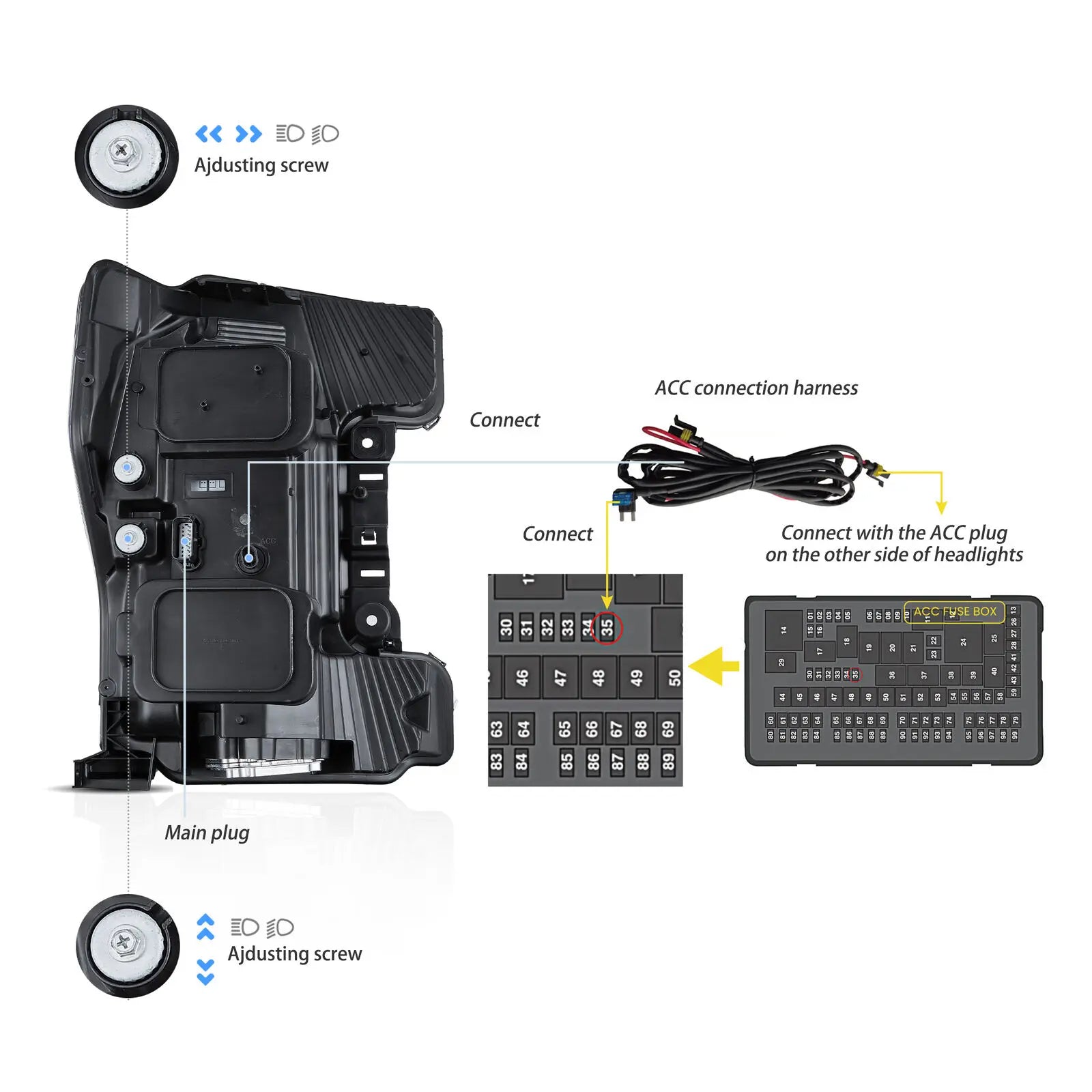 Note: Compatible with factory halogen and LED models, Please use plug adapter and ACC wire for the factory halogen models. (In the accessories package).