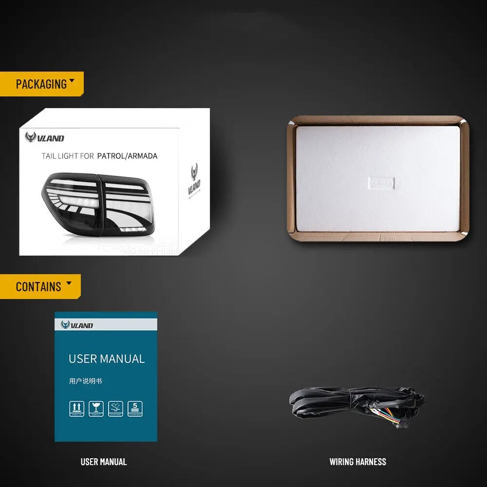 Does your 2012-2019 Nissan Patrol (Y62) or 2017-2020 Nissan Armada deserve lighting that matches its commanding presence? Factory tail lights often fail to capture the full character of your premium SUV with dated illumination and lackluster design. VLAND's engineered LED tail light solution transforms your vehicle's rear profile with sophisticated lighting technology that enhances both safety and style through seamless OEM integration.