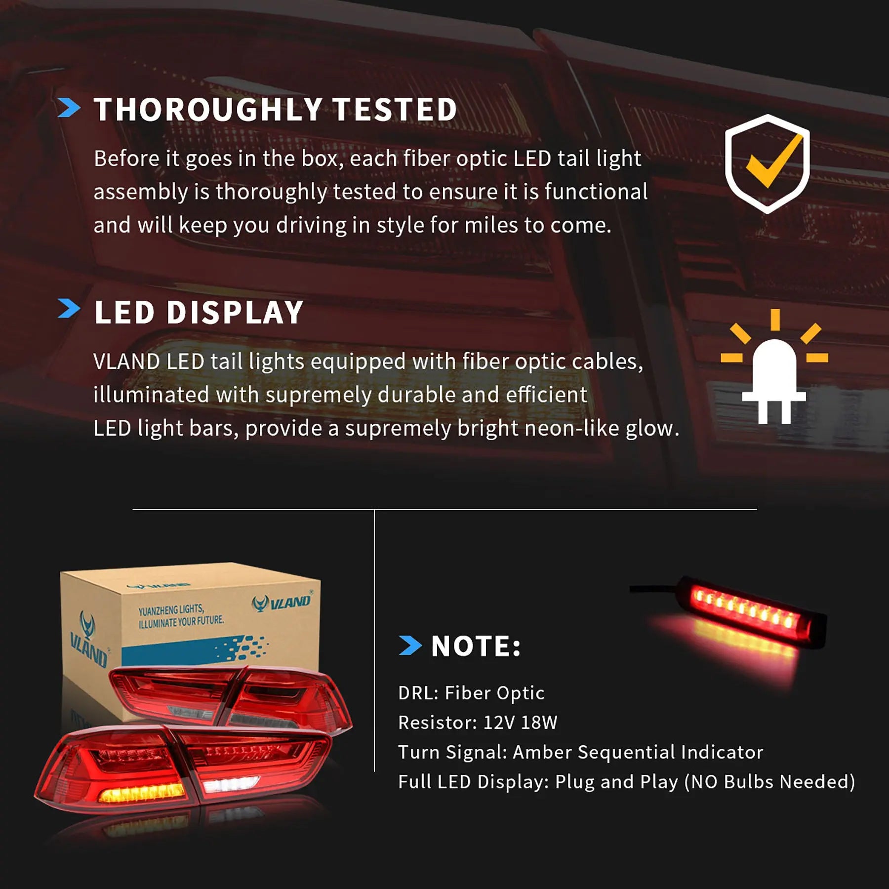 Your 2008-2017 Mitsubishi Lancer was born to be the embodiment of driving pleasure. But does the factory taillight design make this agility seem a bit “quiet” in the night? Dim halogen lights and conservative styling not only lower the vehicle's overall appeal but also pose safety hazards during nighttime driving. VLAND's custom-engineered LED taillights for the Lancer are designed to shatter mediocrity! We understand your pursuit of reliability and factory-level quality. These taillights, blending cutting-edge LED technology with precise fitment, will fully awaken your vehicle's visual soul—it's not just an upgrade, but a milestone that brings your classic ride's design in step with the times.