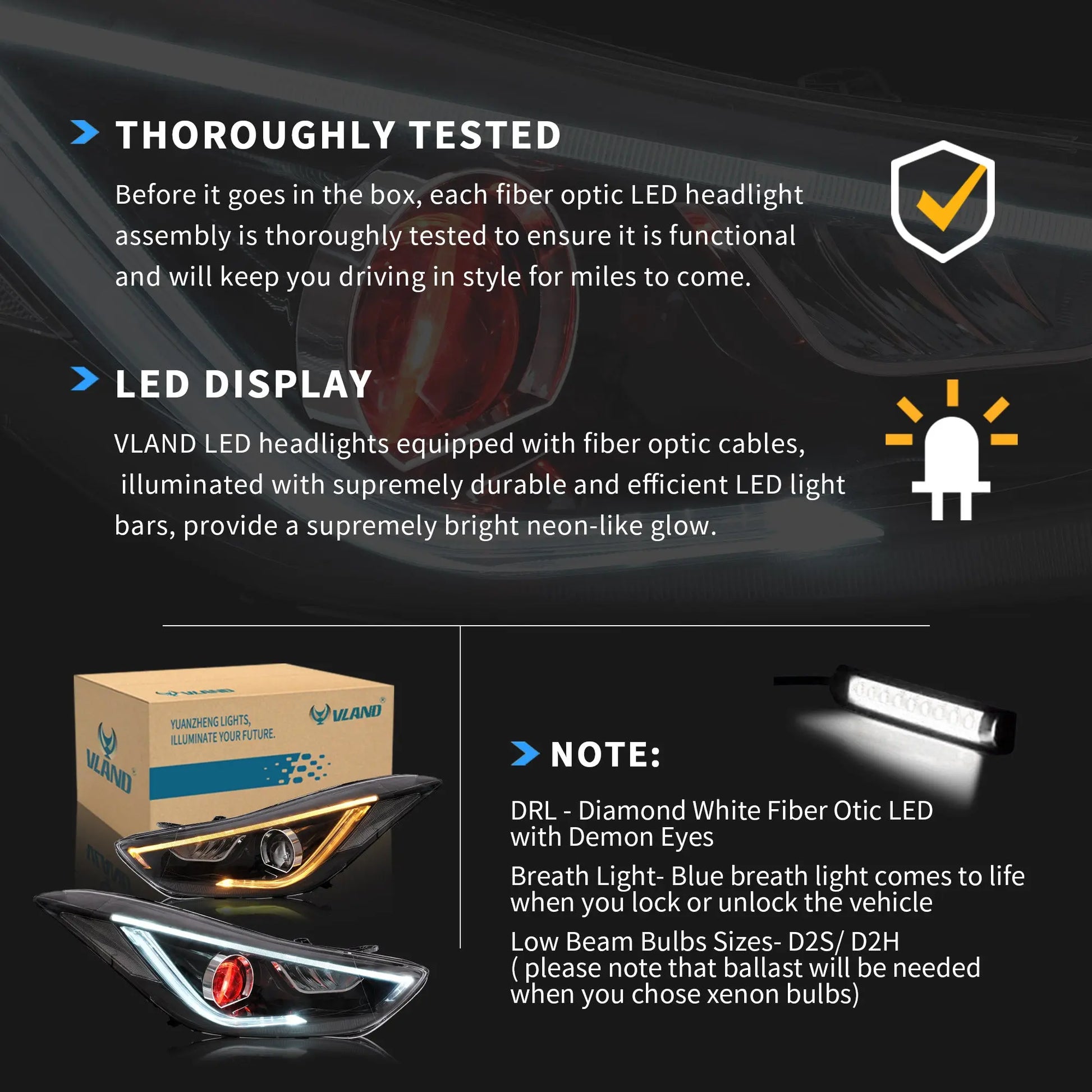 Does your 2011-2015 Hyundai Elantra Sedan or 2013-2014 Avante MD Coupe struggle with outdated halogen lighting that fails to match its sophisticated design? Factory headlights often leave you with inadequate nighttime visibility and a dated appearance that undermines your vehicle's modern character. VLAND's precision-engineered LED headlights deliver a complete transformation, featuring dynamic sequential technology and advanced projection systems that unlock your vehicle's true potential through seamless OEM integration.