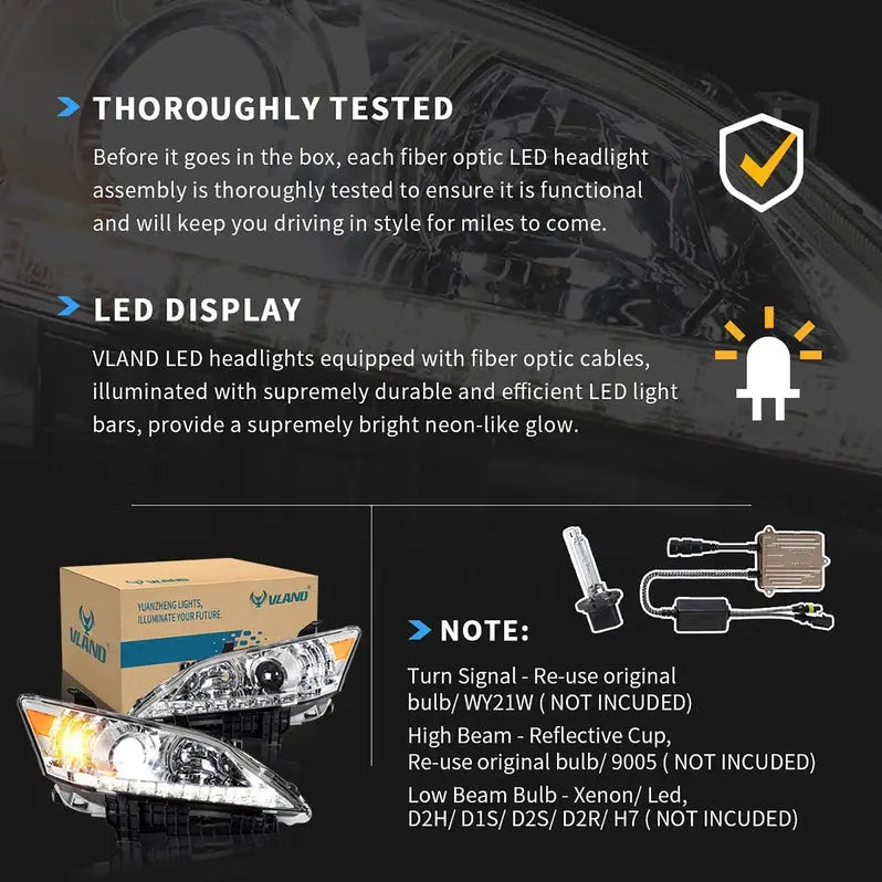 Does your 2010-2012 Lexus ES350 struggle with outdated halogen lighting that fails to match its luxury pedigree? Factory headlights often leave you with inadequate nighttime visibility and a dated appearance that undermines your sedan's sophisticated character. VLAND's precision-engineered projector headlights deliver a complete transformation, featuring advanced optical technology and seamless integration that unlocks your ES350's true potential through direct OEM replacement.